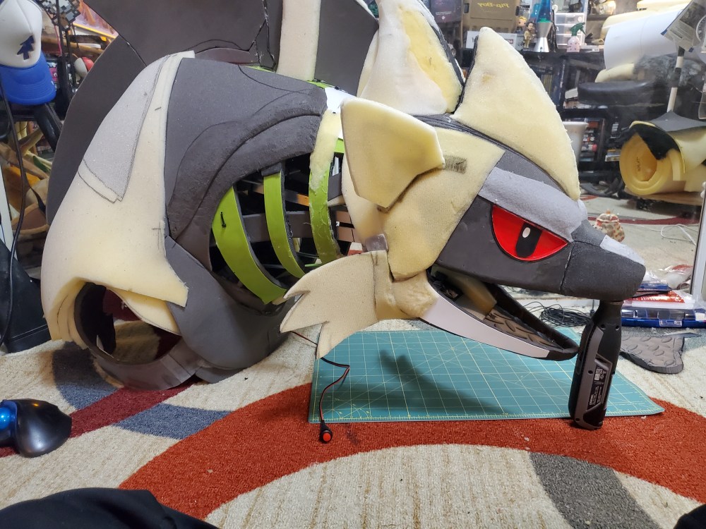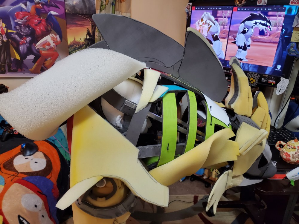 I’ll also add real quick what I did to help the cheek fluff/spiky things stand out in the right way, and make them sort of reinforced but still flexible. Instead of just being made of foam (and thin foam at that, 1/4″), I lined the back with a layer of thin EVA foam, and then added two strips of the same EVA to the back of that in a curved arrangement, so the help make the spikes stick out instead of going in toward the neck.