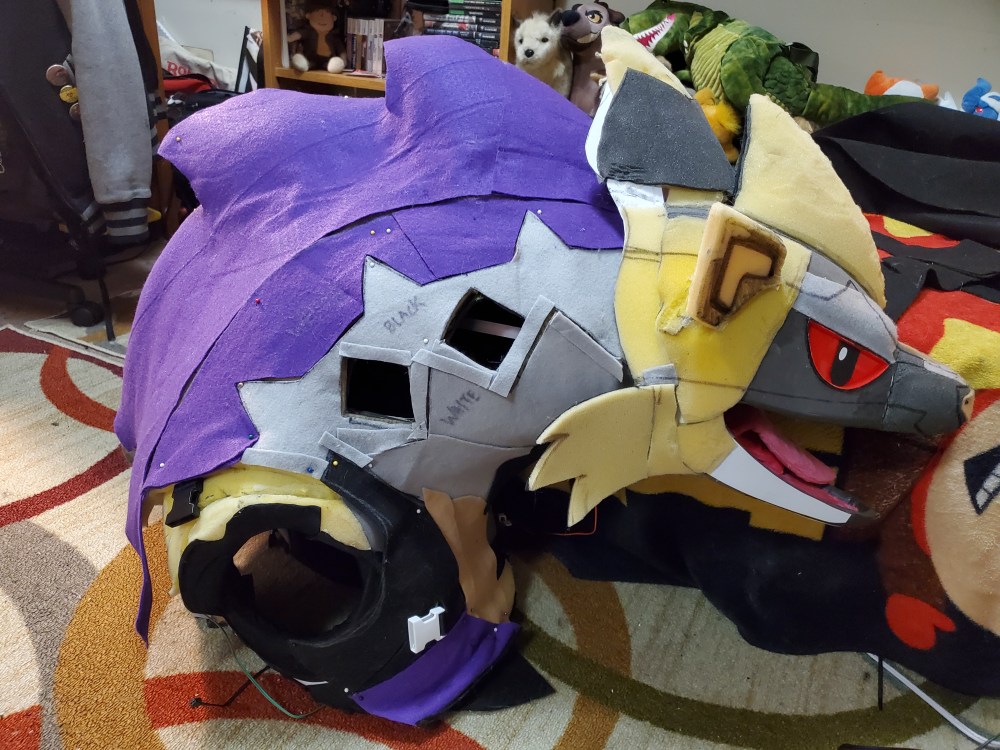 So at this point, his head base is completed! Yay! The next step will be patterning for fur and cutting out the diamonds for visibility. But before I go there, I wanted to add a fun thing: his tongue!