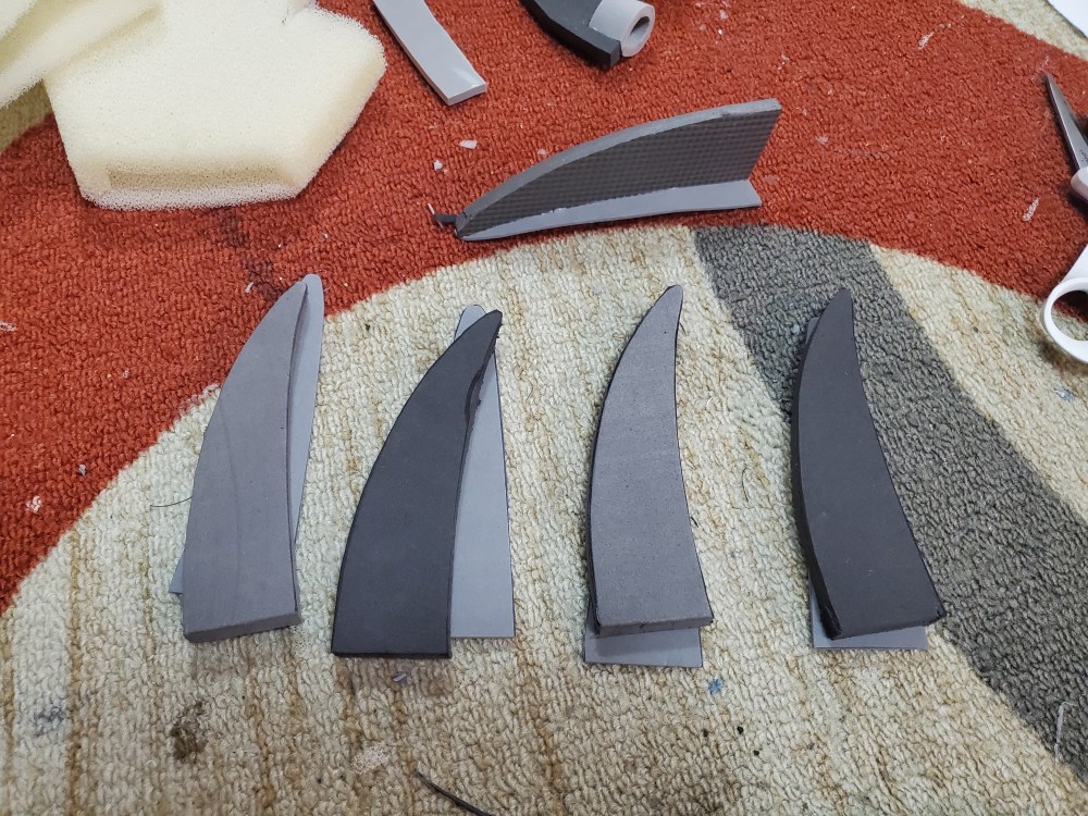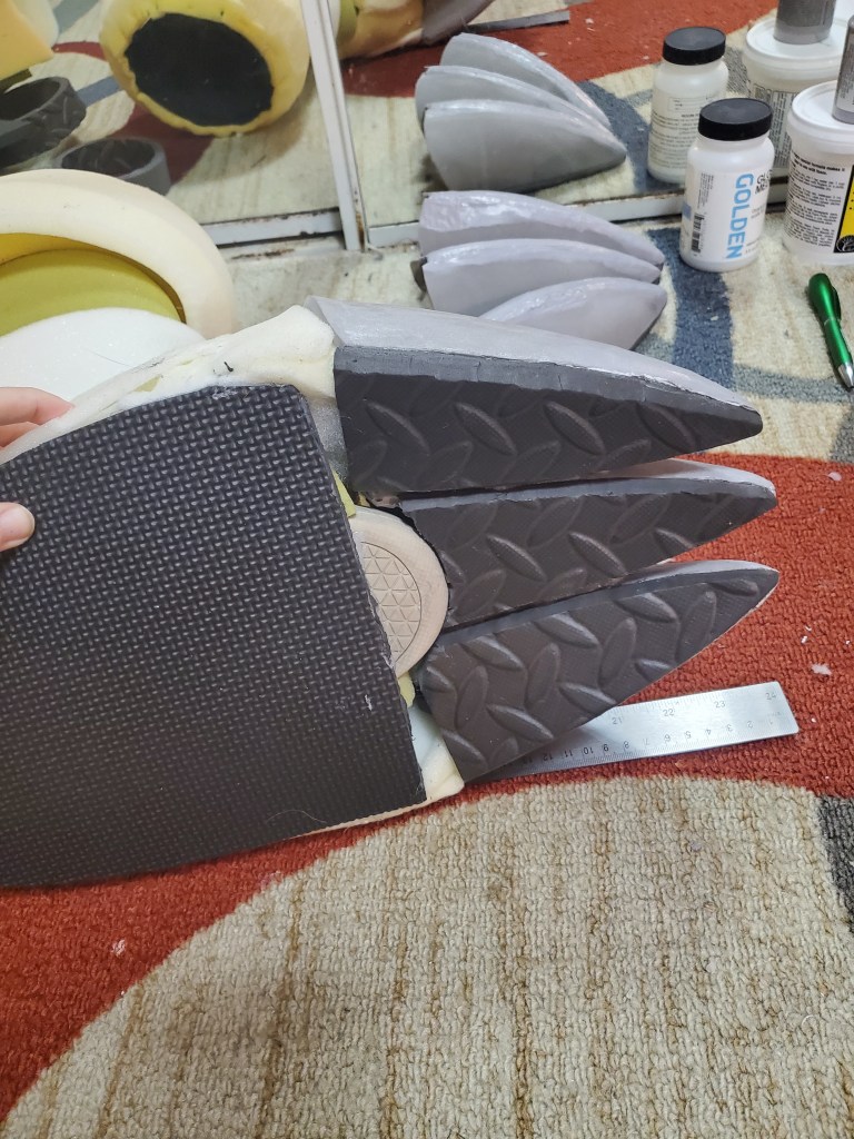 (The weird cutouts in the back was for me to attach it to shoe to test durability!) WHEW, that was a lot of work, and I had to make 6 of them. But they’re worth it I think in their durability and looks! But, lets get back to building the feet. Now that I’m done with the claws, time to move onto the actual feet, and build the real feet claws (I won’t be using this one because of the cutouts, plus it was just for testing).