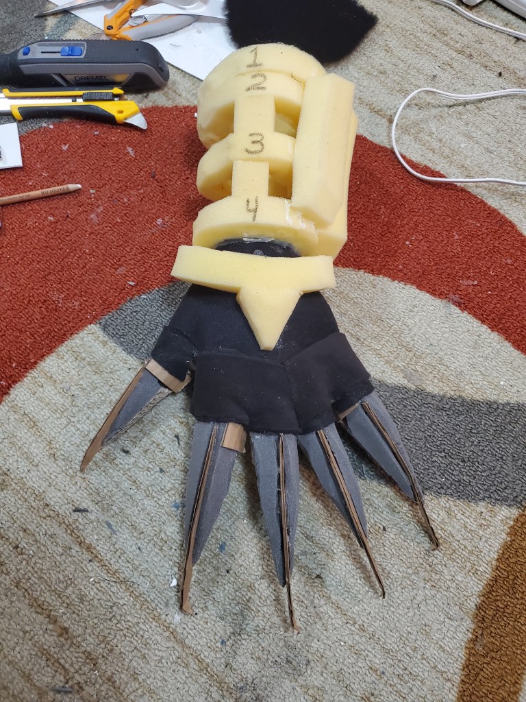 Welcome back to another log post for Vandal! Here I’ll be going over first how I constructed his claws for both his feet and hands, and then how I made the feet and hands themselves using foam. I’ve also decided on a new format in which I will bold specified materials to help point out important notes, or skimming for materials ideas, and I added headers to help organize the post. Enjoy!