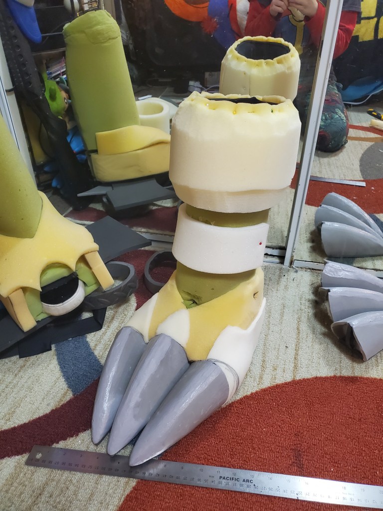 I decided to make the feet and grey leg warmer things one piece, to slip on like boots over a pair of what will basically be pants. Fortunately, I had perfectly sized (height) leg foam wraps from my old Peridot cosplay which was otherwise starting to fall apart, so I recycled other pieces just for stuff like this (I kept her hair and goggles though, very proud of those!) So I grabbed those out of storage, cut the toes off and add the newly made claws to them, along with a new pair of shoes and bam, there’s the start to Obstagoon feet! I also made a quick, basic liner out of spandex that I sewed into the bottom near the shoe, and will sew the top into the fur when I get there. I added foam and Polyfil under a layer of 1/4″ foam to create the curvy shape of the legs, and Plasti-Dipped when I was all done.