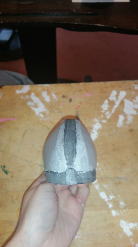For these issues, I tried 3 different products, only 1 of which worked the way I had hoped. 2 of them were “foam clay” products (the first one from TNT Cosplay and the second from Michaels), but I found them both difficult to adhere to EVA foam (the stuff from TNT impossible, actually, I believe it to be freeform sculpting only, and the Michaels stuff was difficult to blend into the EVA). I had a lot more issues with both of these products that I won’t discuss here, I’ll simply say they didn’t work for this usage. They’re likely fine and even good products for other things, just not what I needed for this project. What did work, however, was actually the cheapest of the 3 products: Foam Putty by Woodland Scenics. This stuff can be found in most hobby shops and is usually used when sculpting terrains for railroad models and similar things. It doesn’t shrink, it dries super quick, it’s sandable, and best of all, it likes to stick to EVA foam and can be easily blended into the EVA at the edges unlike the Michaels foam. The only unfortunate thing is that it’s not really flexible. It can bend a very slight amount, but it will crack eventually. I found a fix for this however, which I will go over in a moment.
