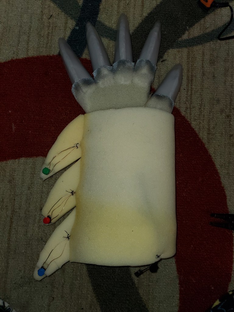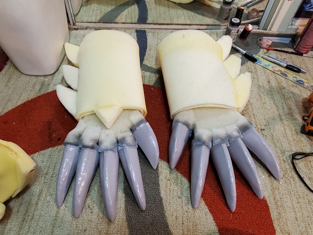 I sealed each claw with 4 layers of black Plasti-Dip (spray, btw, not the actual dip) and then 3 layers of white Plasti-Dip. This is just the way I tend to like to seal EVA foam so I know I got every bit of the original foam. (I should have taken a pic before painting, but I did not; apologies, oof).