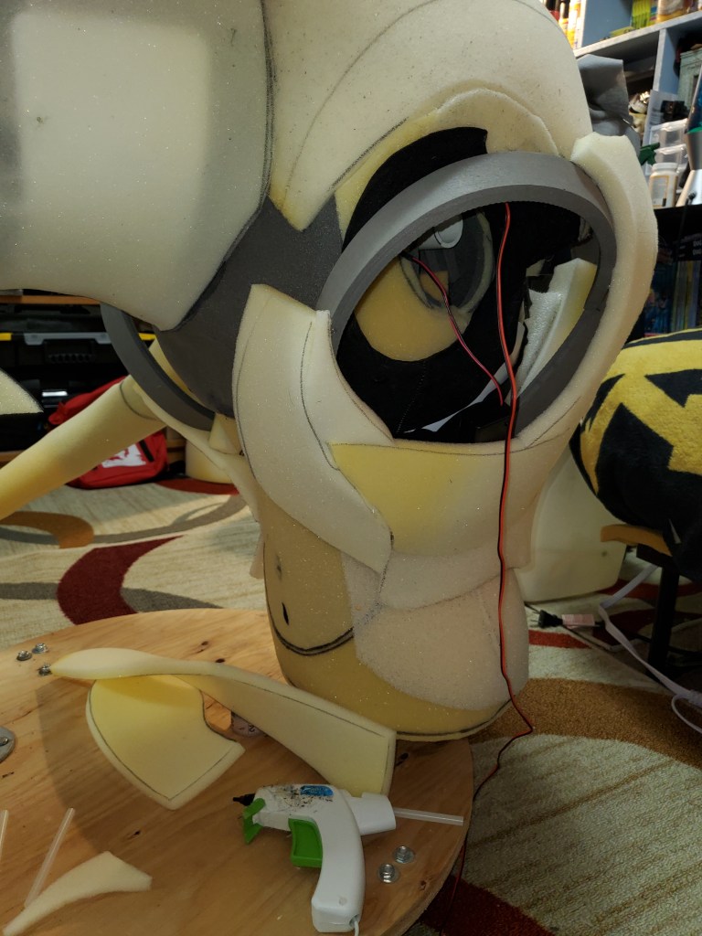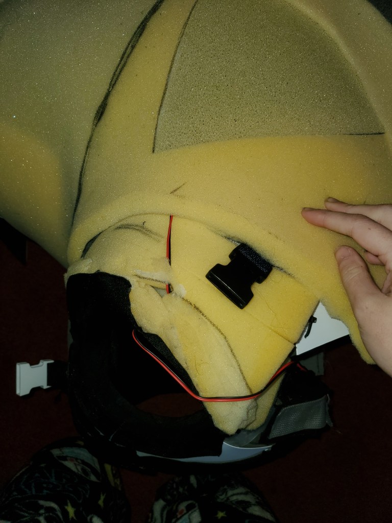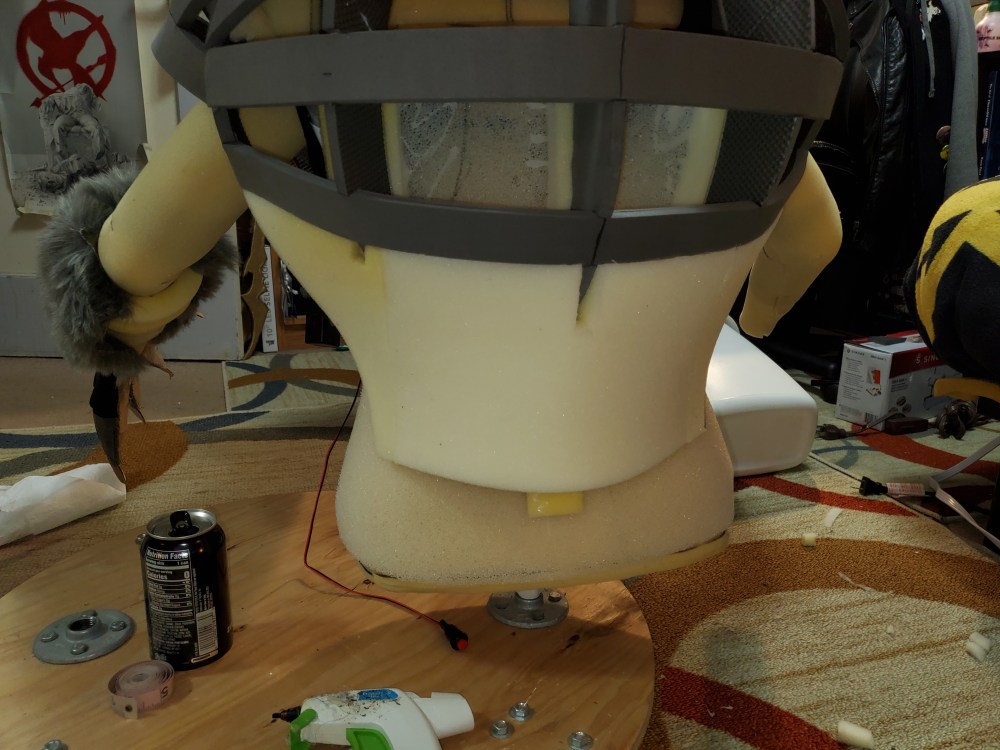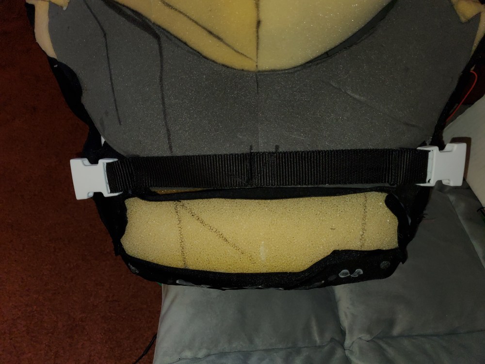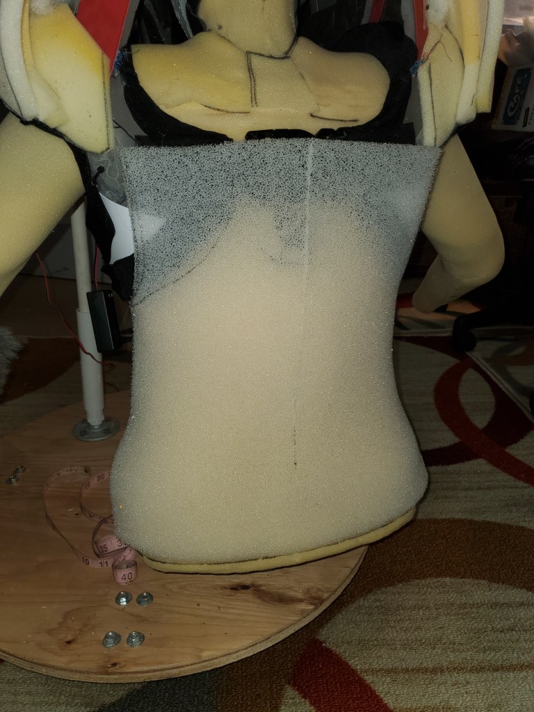I knew the vest would be the biggest undertaking other than the head. I mean, the thing is huge. Initially I thought of having it be solid foam, and placing cooling packs in it, but as I thought about it more, I came up with a different idea. I ended up making significantly less pockets for cooling packs because I’m not sure they’ll be entirely necessary anymore. I ended up using more reticulated foam and a hollow cage for the vest structure. Here’s some progression photos of building out the vest: