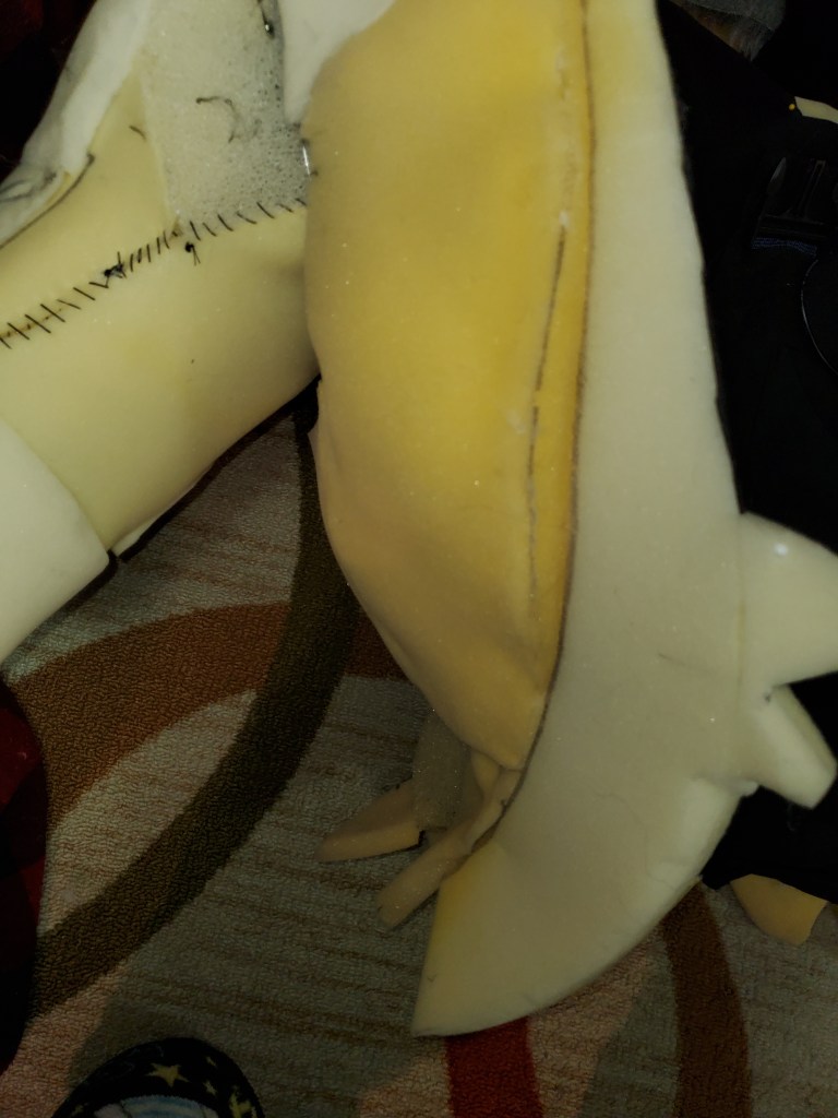 Once I had the base done, I went ahead and made a liner for it out of spandex (which I don’t have WIPs of), making sure not to glue the edges since I haven’t added the fur yet and I want to sew it in.