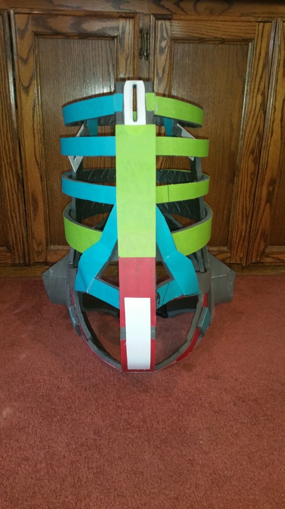 I’d also like to mention here that I slightly altered the arm hole area in a couple of ways. For one, I didn’t like how cramped my head felt inside the neck, so I padded above the shoulders so the whole thing would ride higher on my shoulders. This of course made the helmet, which was attached to the spine via elastic, a little too far up, so I snipped the elastic. It is SO much more comfortable now! I had to remove some of the plastic from below the armhole though now that everything sits higher, because it was cutting into my armpit a little. To make up for that removal, I added a bit more around my chest area. This whole rig doesn’t weigh very much (around 5lbs) but if I still decide on adding the full body harness, this will give me more to attach it to.