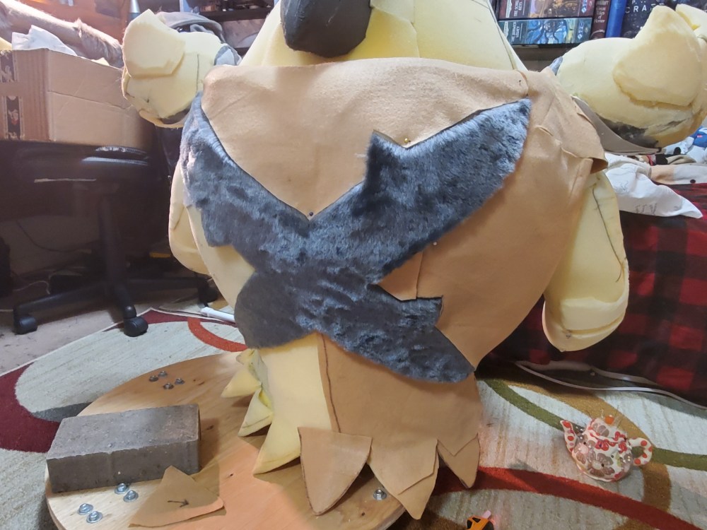 You’ll probably also notice the weird looking patch of foam on the shoulders, it almost looks like a patch of buckram. This is reticulated foam and acts as a vent! Or will hopefully, it really depend on how well the fur I’m using ends up breathing. But hopefully it will help with heat dispersion.
