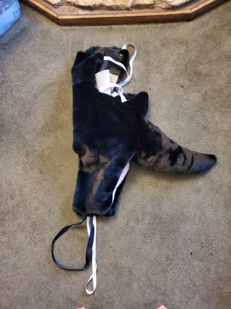 The elastic in the back and over the shoulders is just to help hold the suit on, as I didn’t want the entire back to be covered in fur when the vest is already going over it, for cooling reasons. The straps at the bottom act as stirrups to keep the legs down inside of the “boots” when I put them on. The tail is sewn directly onto the bodysuit, as no real partial-use can exist for this costume.