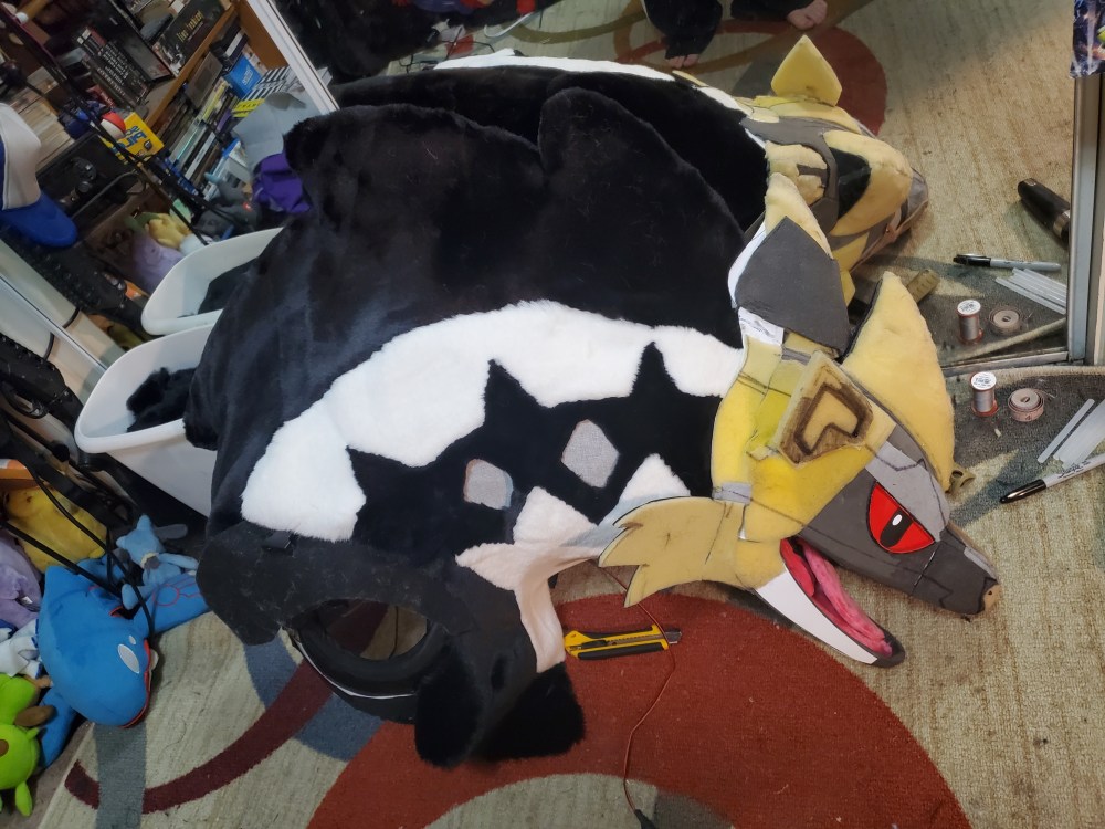 For the future music system I will install a button in each spike of his arm, one for play/pause, and the other two for back/next and probably leave these disconnected until I get the Arduino set up (possible I may use the play button for basic Pokemon music in the beginning but we’ll see). I’m also going to add two fans inside the neck to help cool my face. Even though my face won’t be entirely covered as closely as a regular fursuit, I will be wearing what is basically an EVA foam helmet inside so it will be nice to have some form of air movement, especially since the main vent and visibility (his mouth) is going to be fairly far from my face and I’m not sure how much I’ll get out of the buckram diamonds in the side of his neck.