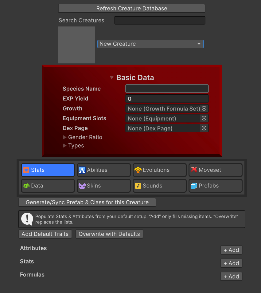 Create your creature using the dedicated Creature Editor window. From stats, to elemental typing, to abilities and more, add what makes this creature unique!