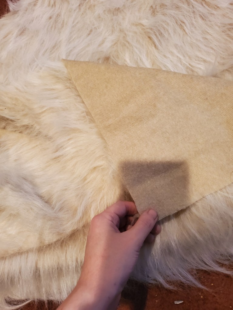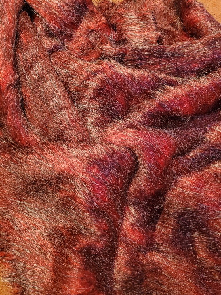 Originally purchased for making a suit of McKinley, until I found more accurate fur for him. It is considered “feather fur” by some people, as it has black and white striped tips. It also has subtle darker stripes throughout the pile (see pictures), please be aware of this! The backing is red and slightly softer than normal faux fur, and a little less heavy.
