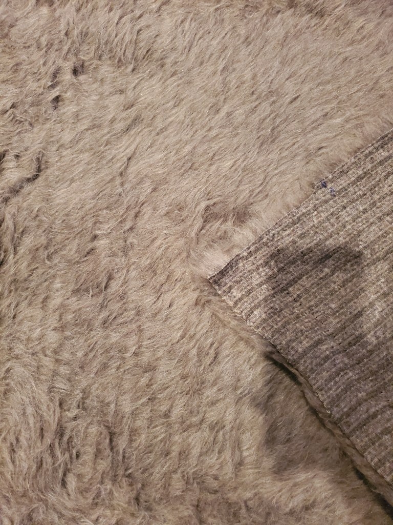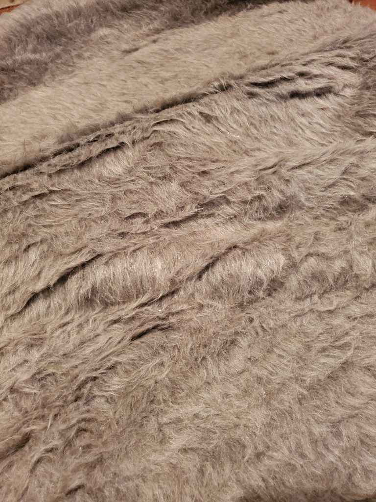 Originally purchased for a werewolf costume but no longer using. There is a slightly unrealistic shine to some strands in the fur, not quite like tinsel fur (not as noticeable) but reminds me a bit of somewhat low quality craft fur. However, the fur itself doesn’t seem entirely low quality, the backing is decent (not great, but decent) and the density of the fur is good. It is soft and dense enough to be shaved. Has flecks of black and white in it so it’s not one single colour if you look closely. I can send a small swatch if you’re not sure about it! Just ask.