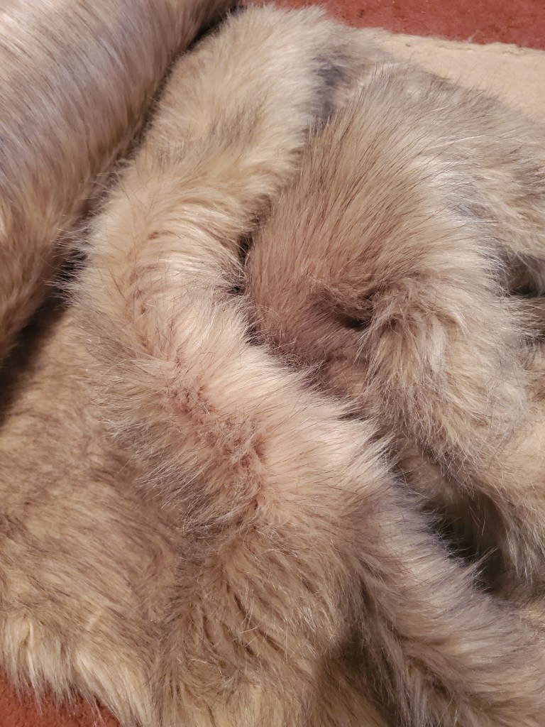Originally purchased for my, now canceled, fathier (Star Wars) cosplay/fursuit. It is a lovely tan with black wisps and tips scattered throughout. The backing is nice and heavy. I used some of this fur for my pre-made antlered wendigo, which is also for sale. If you buy him