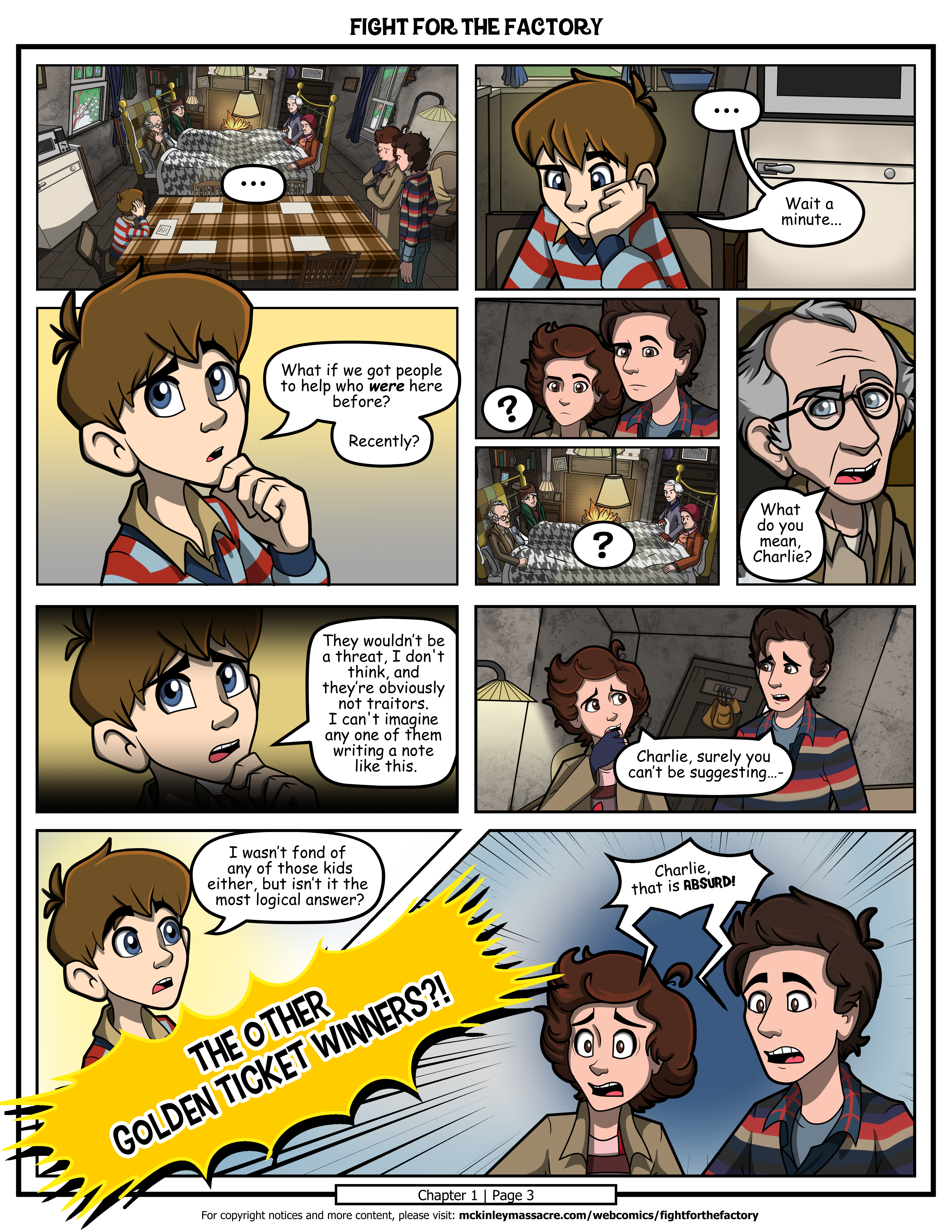 Chapter 1: The Note <—back Synopsis:Charlie comes up with a plan to help defend the factory from possible danger.# of Pages: 3/7 <—Back Next chapter—> Share this: Click to share on Facebook (Opens in new window) Facebook Click to share on X (Opens in new window) X Click to share on Pinterest (Opens in new window) Pinterest Click to share on Tumblr (Opens in new window) Tumblr Click to share on Telegram (Opens in new window) Telegram Click to share on Reddit (Opens in new window) Reddit